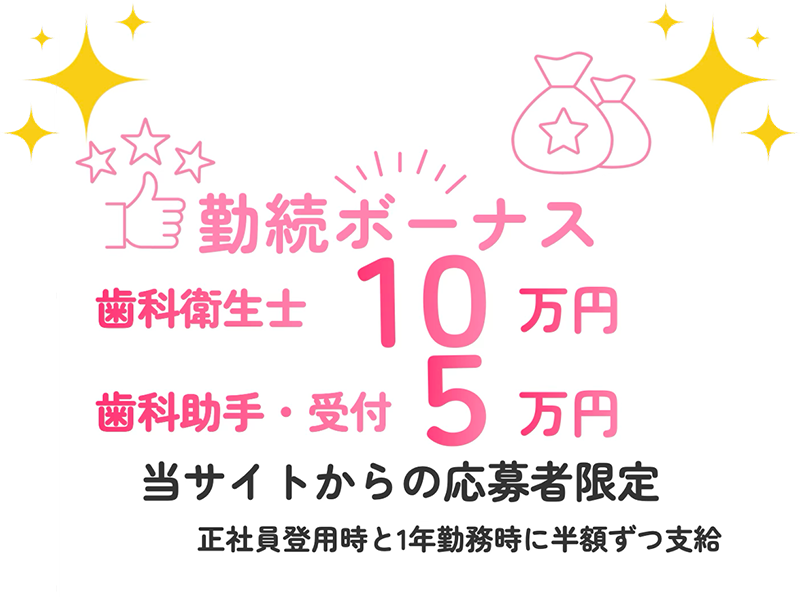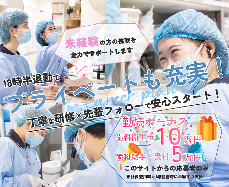 歯科衛生士の方には、臨床スキルの習得や専門性の向上を全面的にサポートし、患者様に感動していただける接遇面の成長も大切にしています。歯科助手・受付の方には、診療補助や滅菌・準備、患者様対応などを通じて、未経験からでも安心して学べる教育体制を整えており、医院運営を支える重要な役割を担っていただきます。どちらの職種においても、スタッフ一人ひとりがやりがいを持ち、安心して長く働ける環境づくりを大切にしています。